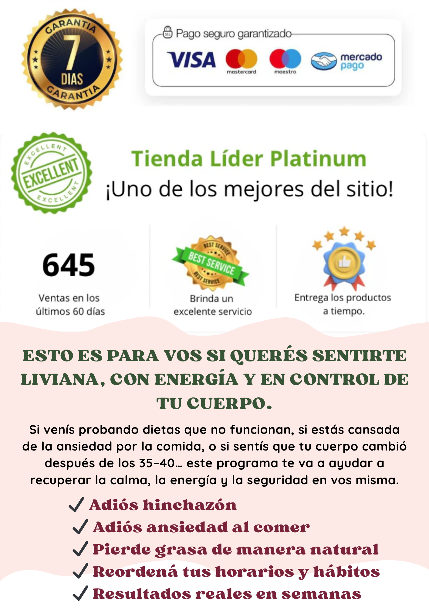 El programa incluye un plan de implementación de 4 semanas que puedes repetir o adaptar a tu estilo de vida, con resultados visibles desde la primera semana.